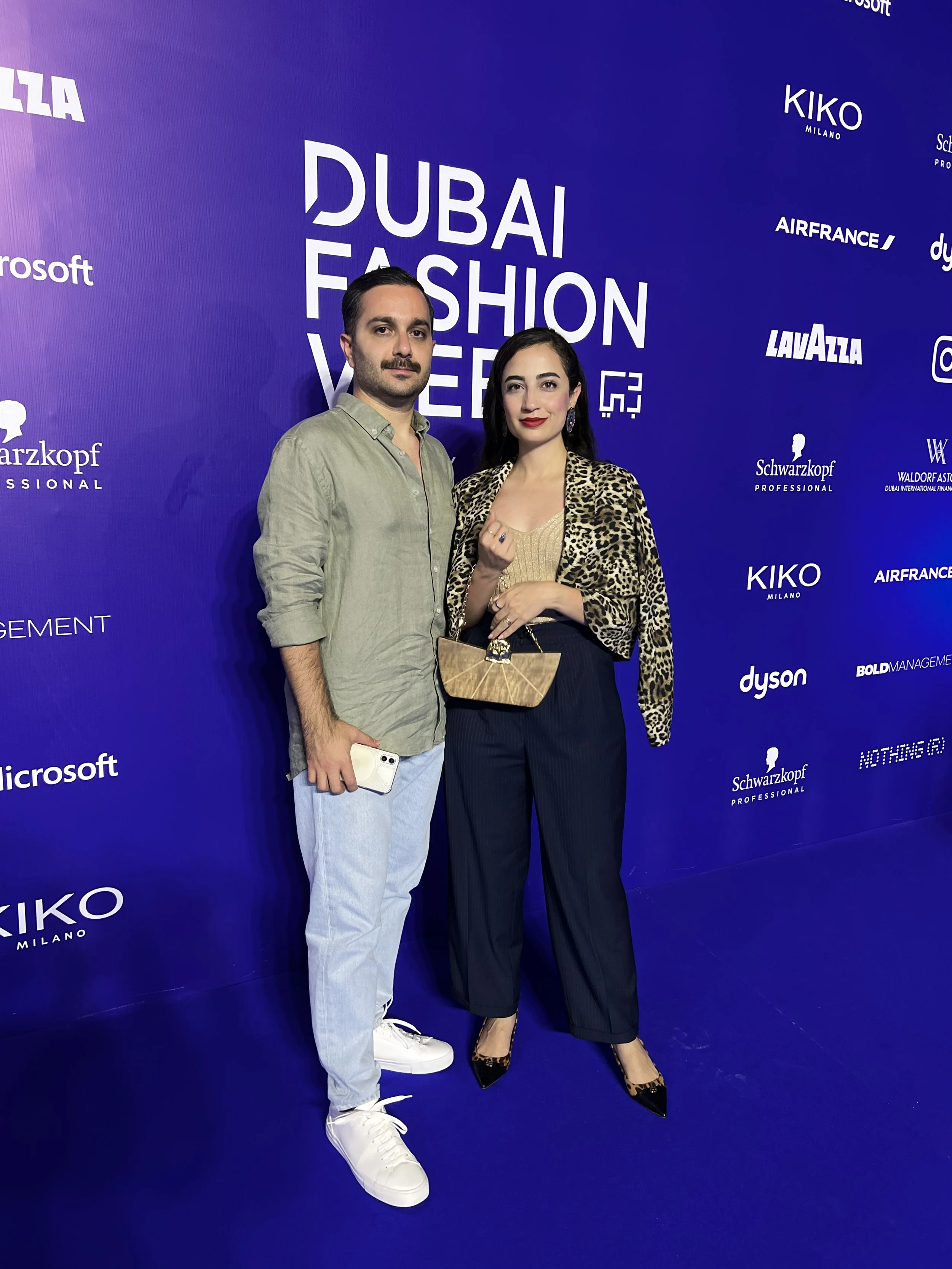 Mohsen and Nazanin presenting AVERS' handcrafted wooden clutches at Dubai Fashion Week 2023, highlighting the brand's unique fusion of Persian art and contemporary design.